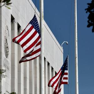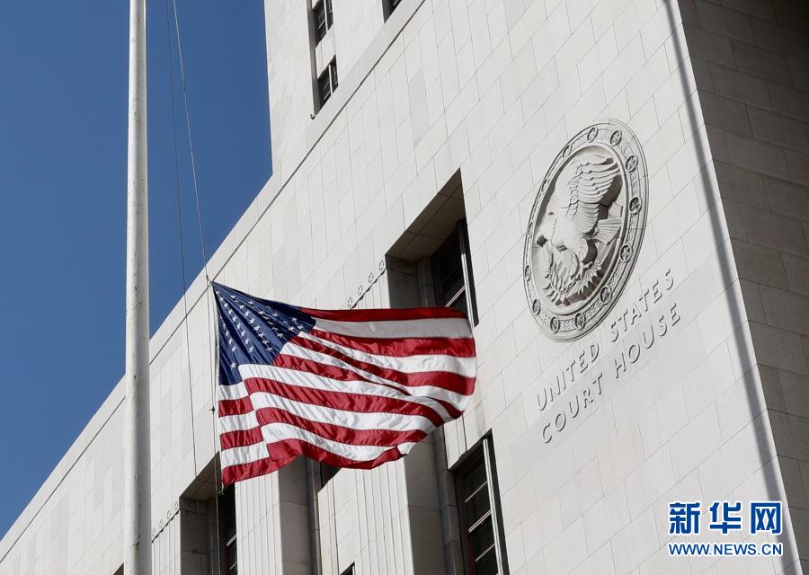 2月25日,美国加利福尼亚州洛杉矶联邦法院大楼前降半旗,哀悼因新冠去世的人。