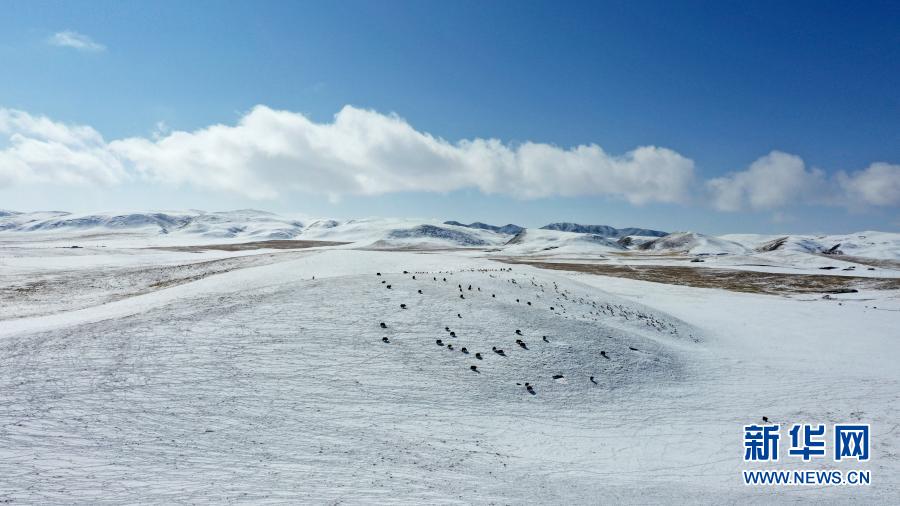 一群牦牛在雪后的草原上活动(2月25日摄,无人机照片)。