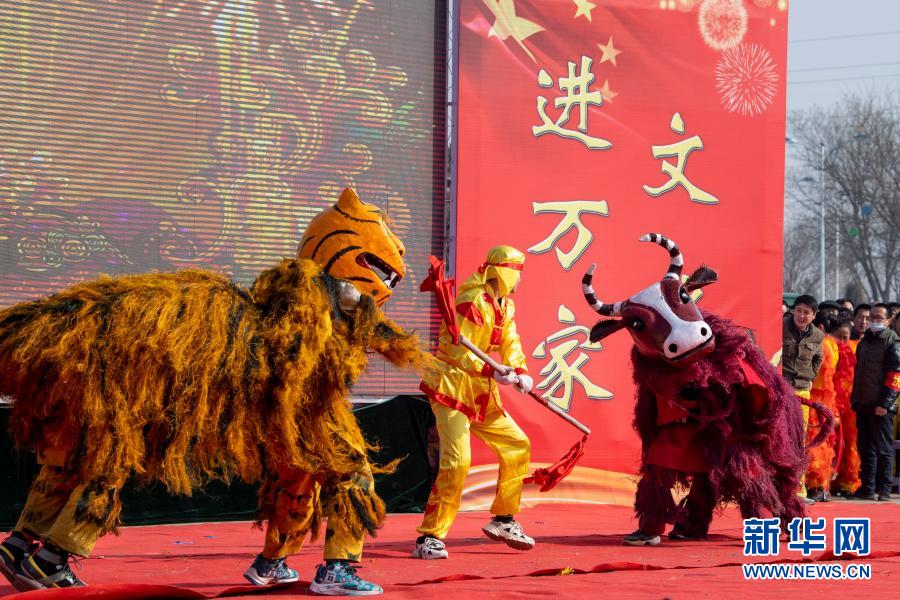 2月26日,山西省灵丘县下关乡下关村的村民在表演传统节目《牛斗虎》。