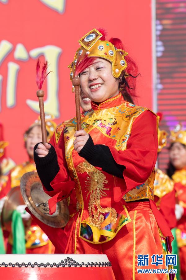 2月26日,山西省灵丘县武灵镇东关村的村民在表演威风锣鼓。