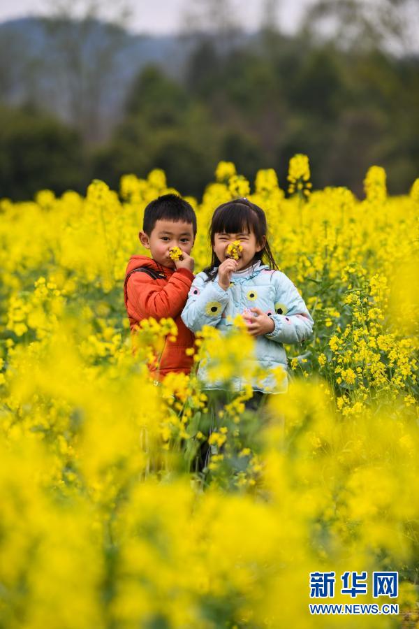 2月26日,在四川省崇州市道明镇,小游客在油菜花田中玩耍。
