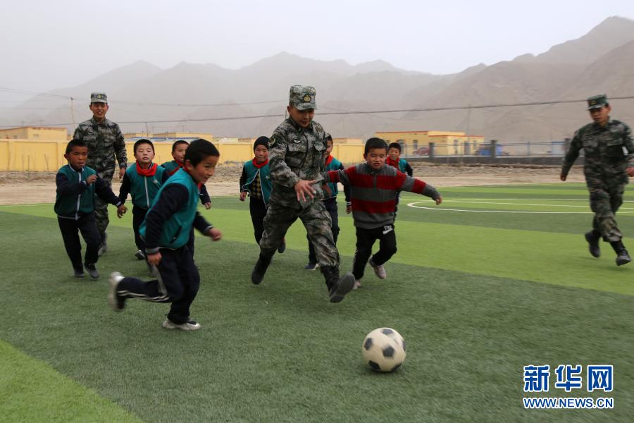 新疆克孜勒苏军分区迈丹边防连官兵走进驻地军民共建希望小学,与孩子们一起踢足球(2020年4月16日摄)。新华社发(刘南松 摄)