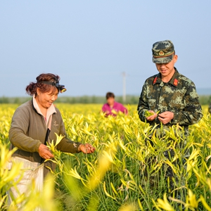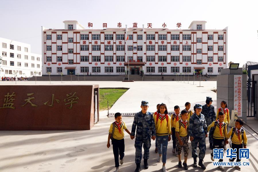 西部战区空军援建的新疆和田市蓝天小学学生与部队教员一起走出校门(2019年5月21日摄)。新华社发(王宝伟 摄)