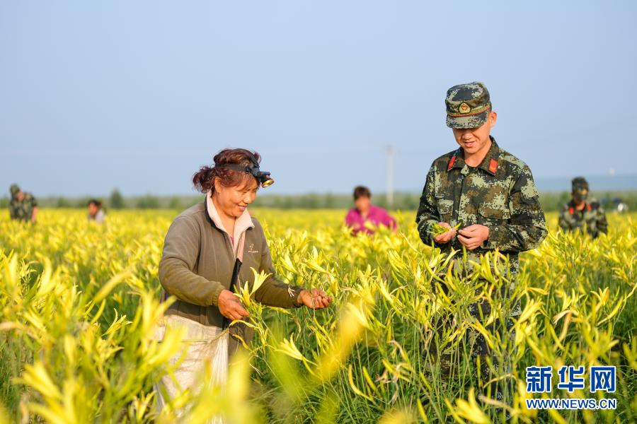 武警山西总队官兵在定点扶贫村大同市瓜园村帮助村民采摘黄花菜(2020年7月22日摄)。新华社发(史利鹏 摄)