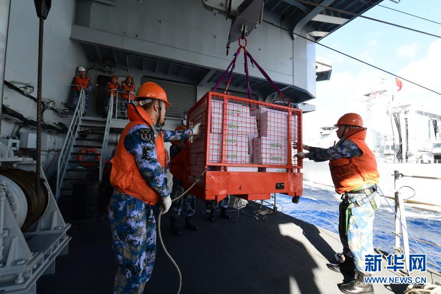 辽宁舰进行海上补给,把从河北易县大兰村订购的农副产品搬运上舰(2020年4月26日摄)。新华社发(赖永斌 摄)