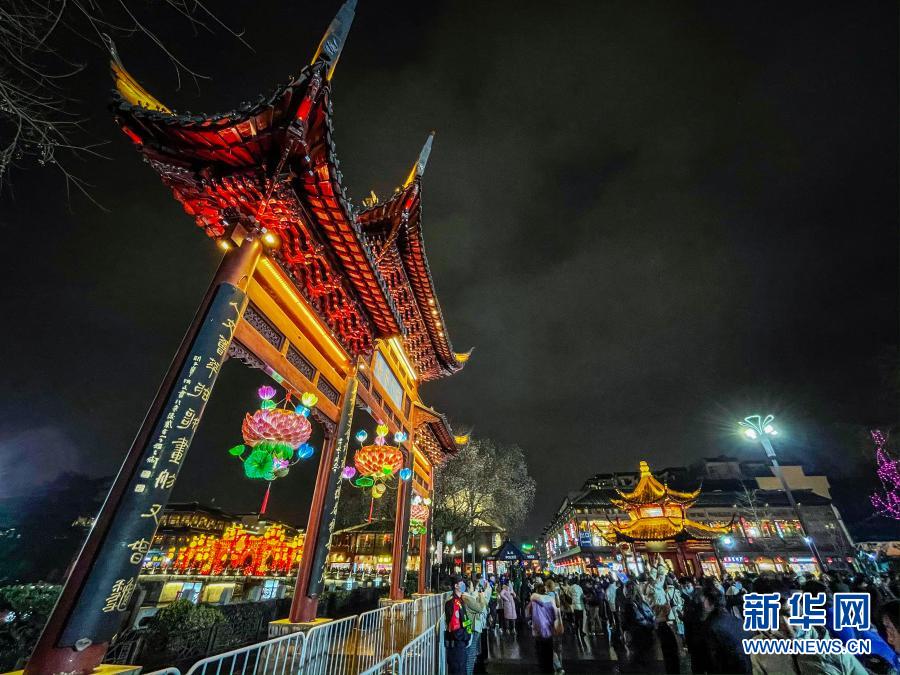 2月26日,游客在南京夫子庙景区内观灯赏景。