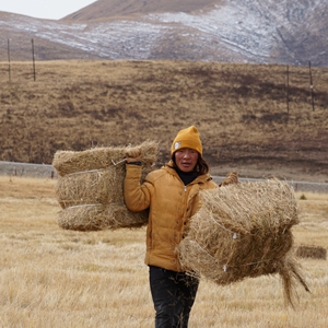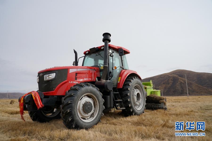 在青海省果洛藏族自治州甘德县江千乡,牧民在饲草基地驾驶打捆机作业(2020年11月3日摄)。新华社记者 陈凯 摄