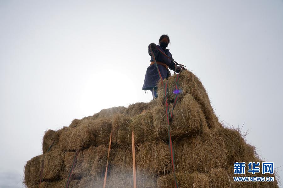 在青海省果洛藏族自治州甘德县江千乡,村民整理刚收割的饲草(2020年11月3日摄)。新华社记者 陈凯 摄