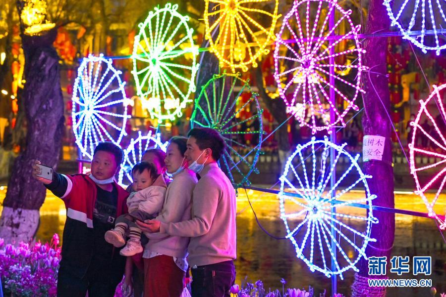 2月26日,游客在云南昆明大观公园观赏彩灯。