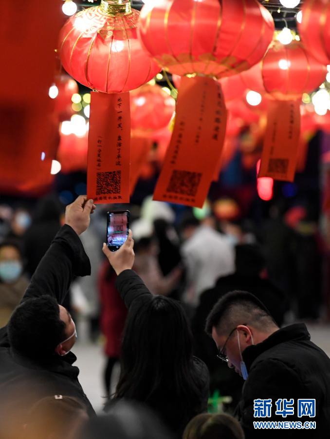 2月26日,人们在宁夏盐池县的长城关扫二维码猜灯谜。