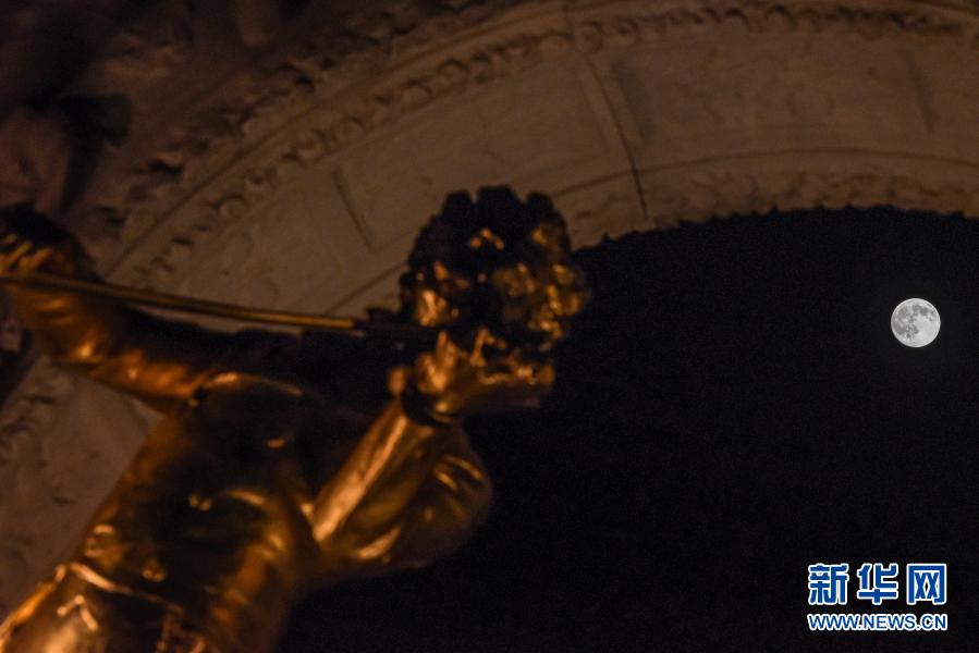 这是2月26日在奥地利维也纳城市公园内的施特劳斯雕像前拍摄的月亮。