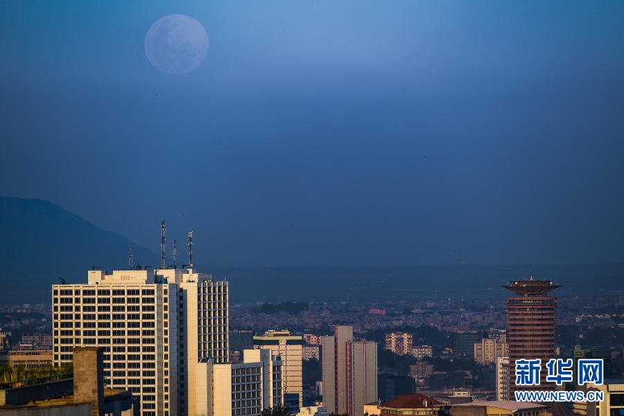这是2月26日在肯尼亚首都内罗毕拍摄的月亮,右下方是肯尼亚标志性建筑肯雅塔国际会议中心。