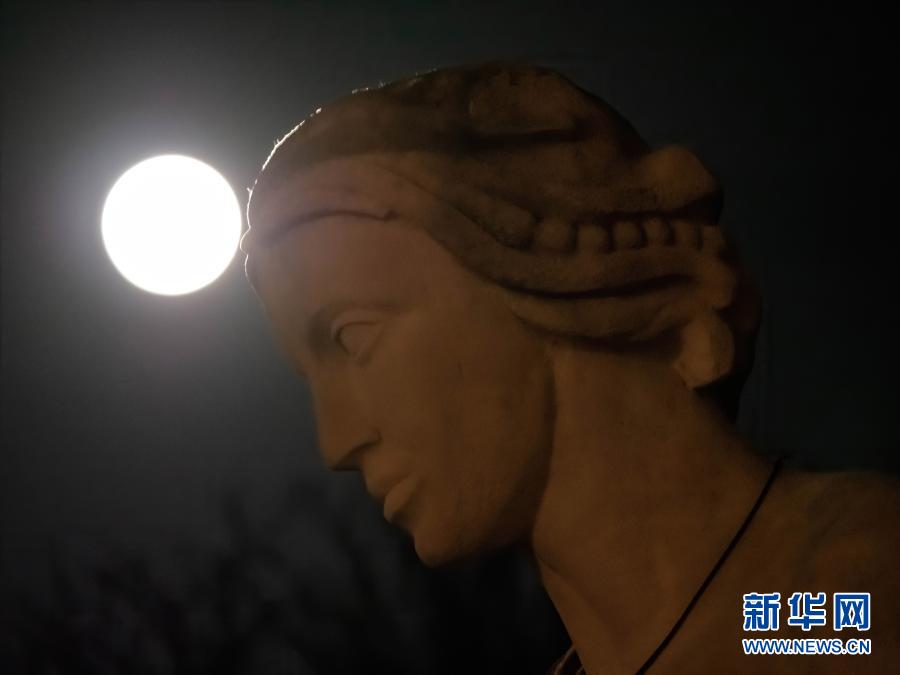 2月26日,在比利时布鲁塞尔,一轮圆月与雕塑相映成趣。
