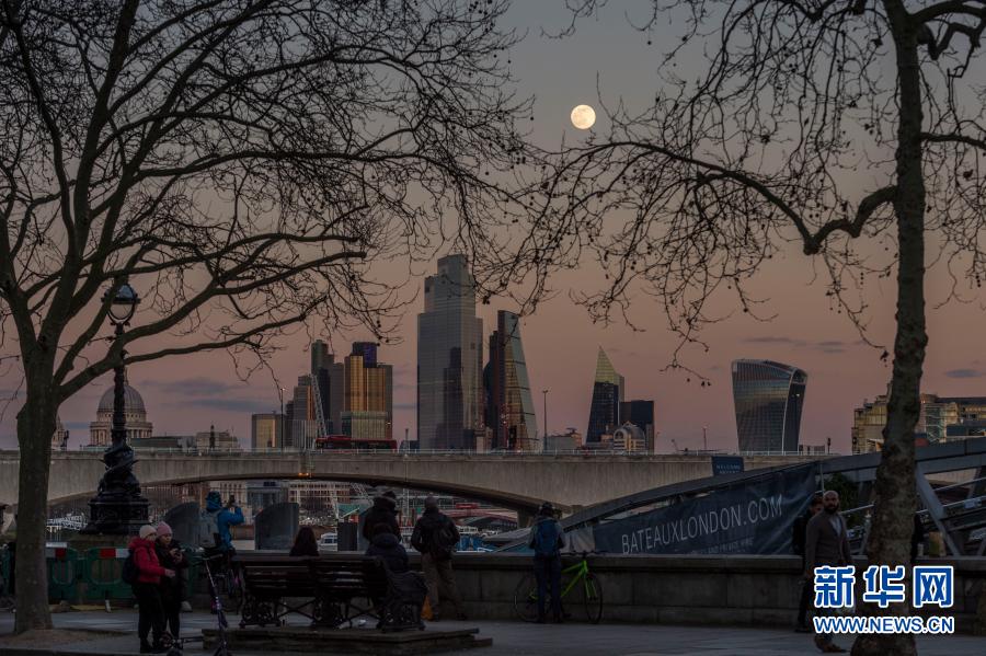 这是2月26日在英国伦敦拍摄的金融城上空的圆月。