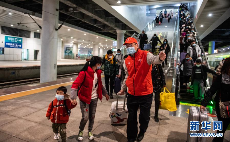 2月27日,贵阳北站工作人员协助务工旅客进站乘车。新华社记者 陶亮 摄