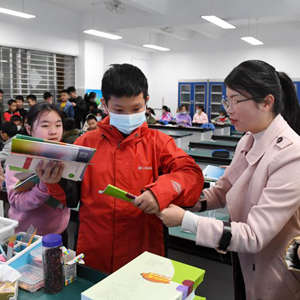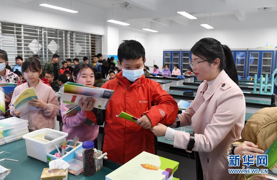2月27日,在广西南宁市滨湖路小学,一名老师(右一)在给学生发放新学期课本。