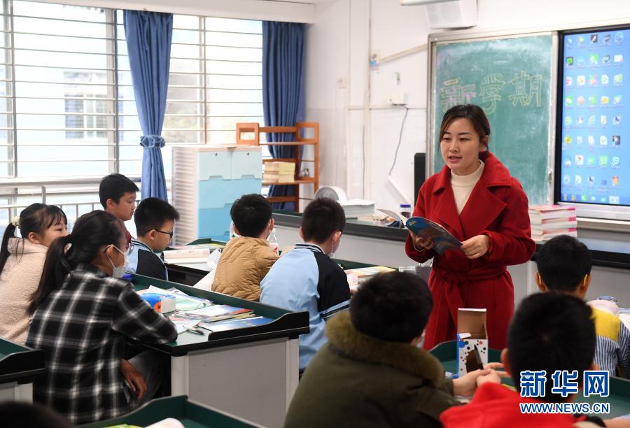 2月27日,在广西南宁市滨湖路小学,一名老师在给学生强调新学期学习注意事项。