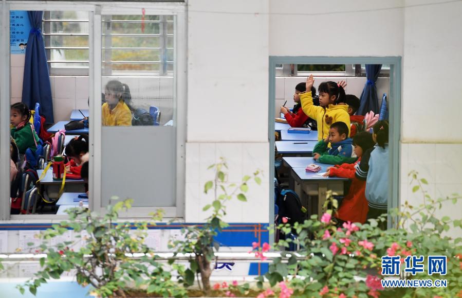 2月27日,在广西南宁市滨湖路小学,学生在教室里举手回答老师的问题。