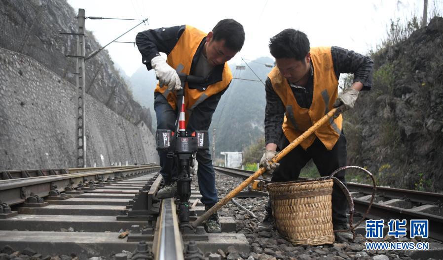 在南昆线冗百站,百色工务段职工在更换钢轨底部胶垫(2月25日摄)。新华社记者 张爱林 摄