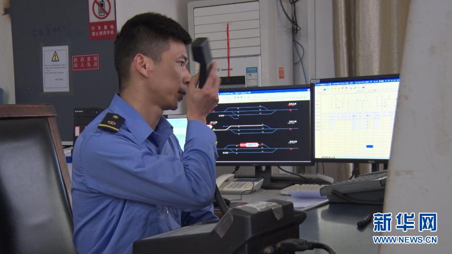 2月27日,在南昆线冗百站,车站值班员周国向司机传达行车指令进行车机联控。新华社记者 张爱林 摄