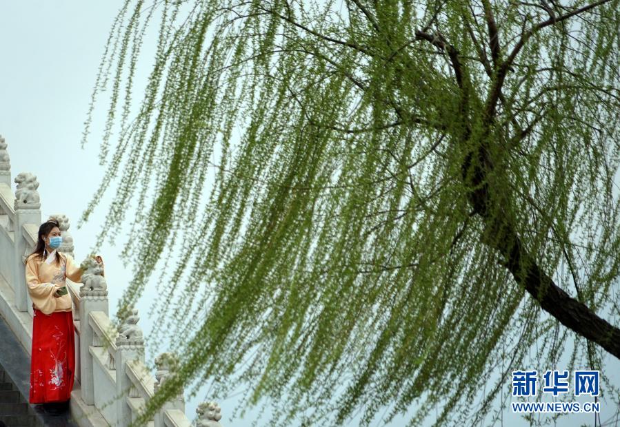 游客在开封清明上河园景区内游园(2020年3月16日摄)。新华社记者 李安 摄
