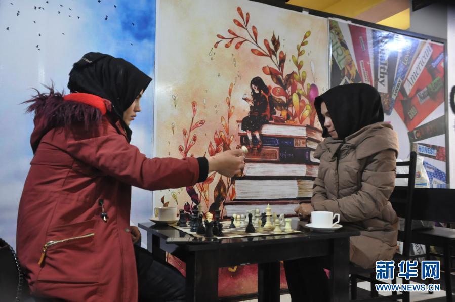 2月20日,两个阿富汗女孩在希比尔甘“橙色咖啡馆”下棋。