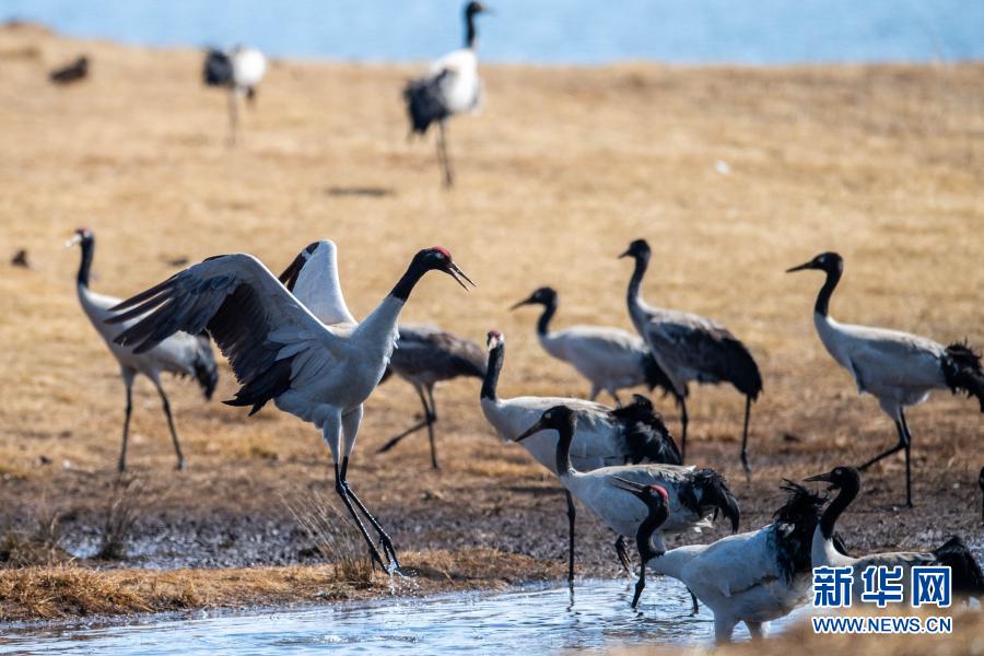 黑颈鹤在大山包大海子湿地嬉戏、觅食(2月26日摄)。新华社记者 胡超 摄