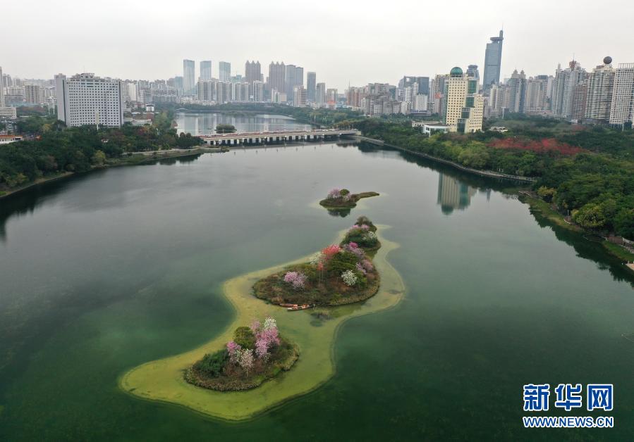 近日,广西南宁市南湖湖心生态岛上木棉、洋紫荆等鲜花盛开,与碧绿的湖水构成一幅春意盎然的美丽画卷。