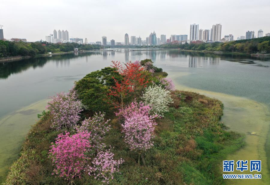 近日,广西南宁市南湖湖心生态岛上木棉、洋紫荆等鲜花盛开,与碧绿的湖水构成一幅春意盎然的美丽画卷。