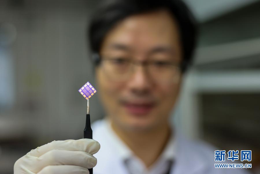 在中国科学院重庆绿色智能技术研究院的实验室内,全国人大代表史浩飞展示他带领的团队制备的石墨烯光电器件(2月8日摄)。新华社记者 刘潺 摄