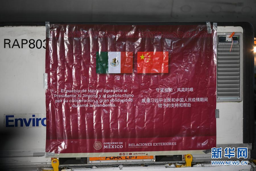 2月27日,在墨西哥首都墨西哥城国际机场,墨西哥外交部将写着中西双语感谢字样的海报挂在装有中国科兴新冠疫苗的温控集装箱上。新华社记者 辛悦卫 摄