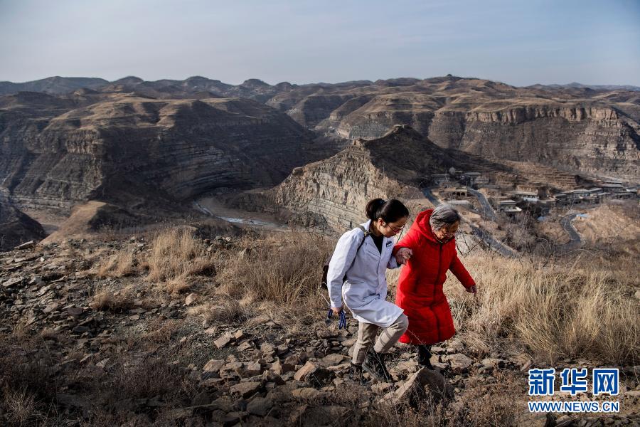 路生梅(右)与同事一起去佳县店镇贺家沟村一名卧床不起的病人家义诊途中(2月4日摄)。新华社记者 陶明 摄