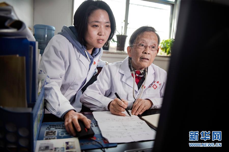 路生梅(右)与佳县中医院儿科医生高苗苗一起探讨患者病情(2020年4月8日摄)。路生梅坚持传、帮、带年轻人,传授自己的医术。新华社记者 陶明 摄