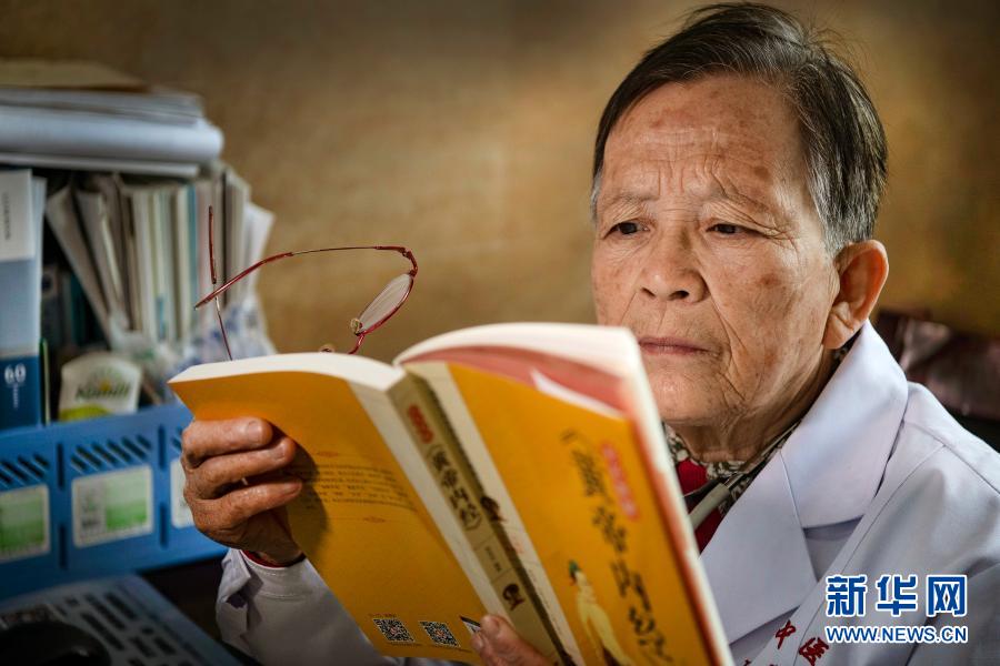 在佳县中医院门诊义诊的路生梅,没有病人时坚持看书学习(2020年4月8日摄)。新华社记者 陶明 摄