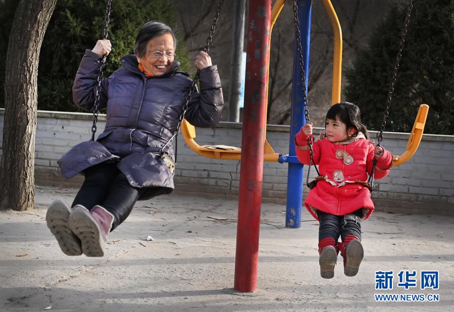 路生梅(左)去佳县店镇贺家沟村义诊,在等待带路人期间,与小朋友一起荡秋千(1月18日摄)。新华社记者 陶明 摄