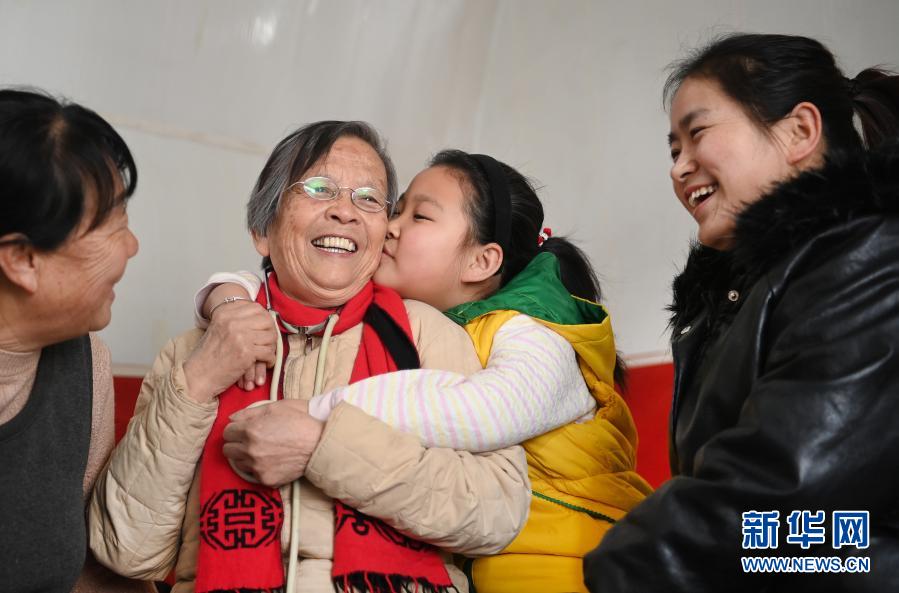 路生梅(左二)在佳县佳州街道凌云社区义诊时,8岁的张宇旋亲密拥抱她(1月17日摄)。张宇㫌的妈妈(右一)、奶奶(左一)都曾让路生梅看过病。新华社记者 陶明 摄