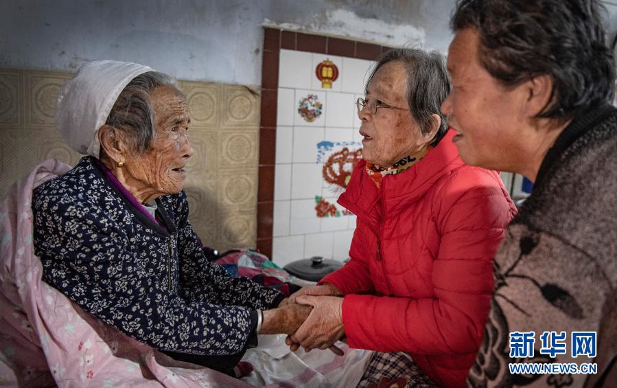 路生梅(中)在佳县店镇贺家沟村为93岁马候问老人义诊后,老人感谢不已(2月4日摄)。新华社记者 陶明 摄