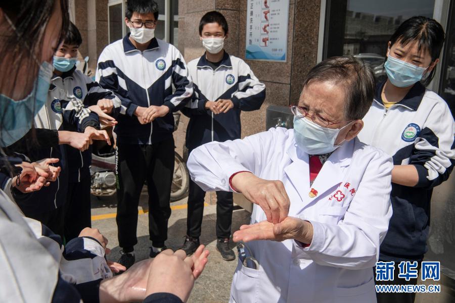 路生梅(前右)在佳县第一中学为中学生讲解洗手防疫知识(2020年4月8日摄)。新华社记者 陶明 摄