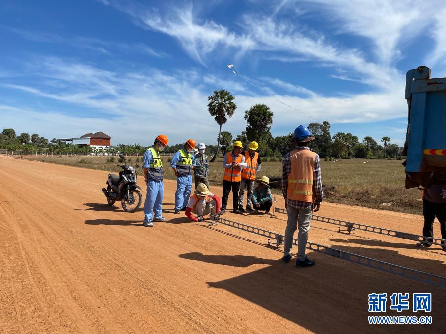 这是2021年2月1日在柬埔寨磅清扬省拍摄的中国援柬乡村道路项目二期施工现场。新华社发(上海建工集团供图)