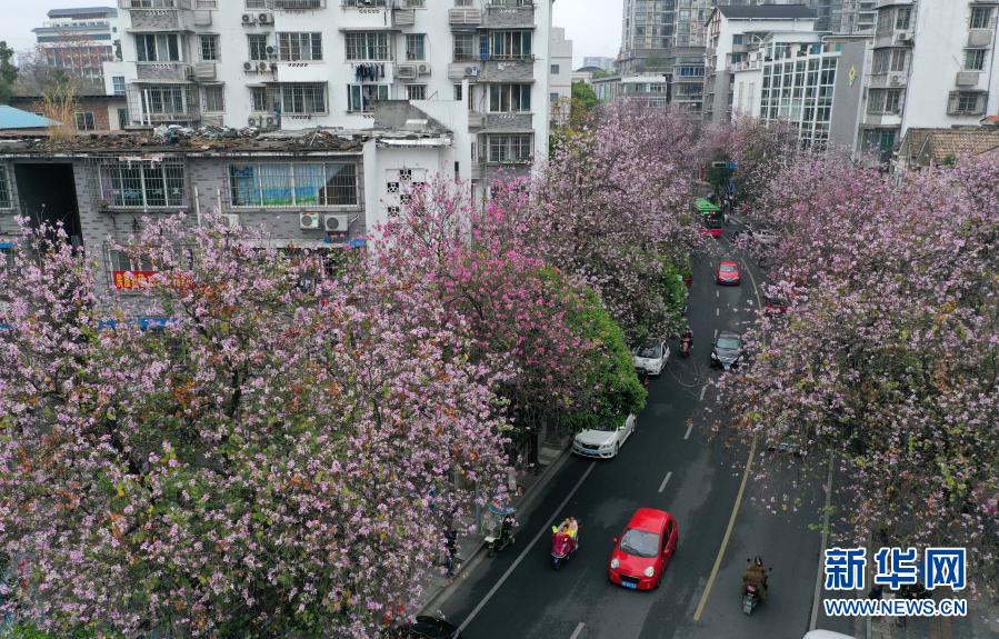 近日,广西柳州市洋紫荆陆续盛开,市区近百条街道和多个公园、小区逐渐变成花的海洋。洋紫荆是柳州市市花,柳州市区共种植洋紫荆28万株。
