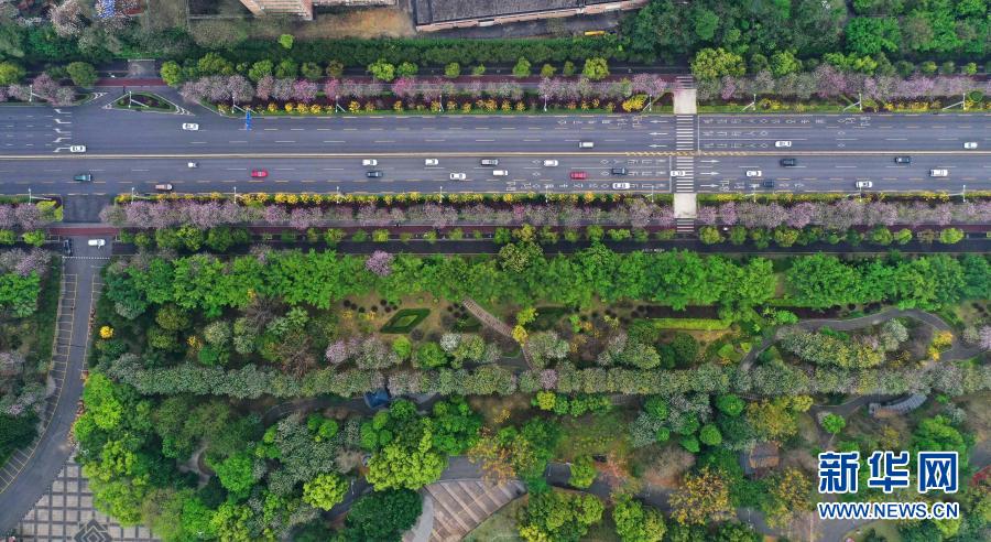 近日,广西柳州市洋紫荆陆续盛开,市区近百条街道和多个公园、小区逐渐变成花的海洋。洋紫荆是柳州市市花,柳州市区共种植洋紫荆28万株。