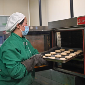 2月25日,在四川省阿坝县托岗黑青稞生产车间内,工作人员对烘焙后的黑青稞饼进行包装。
