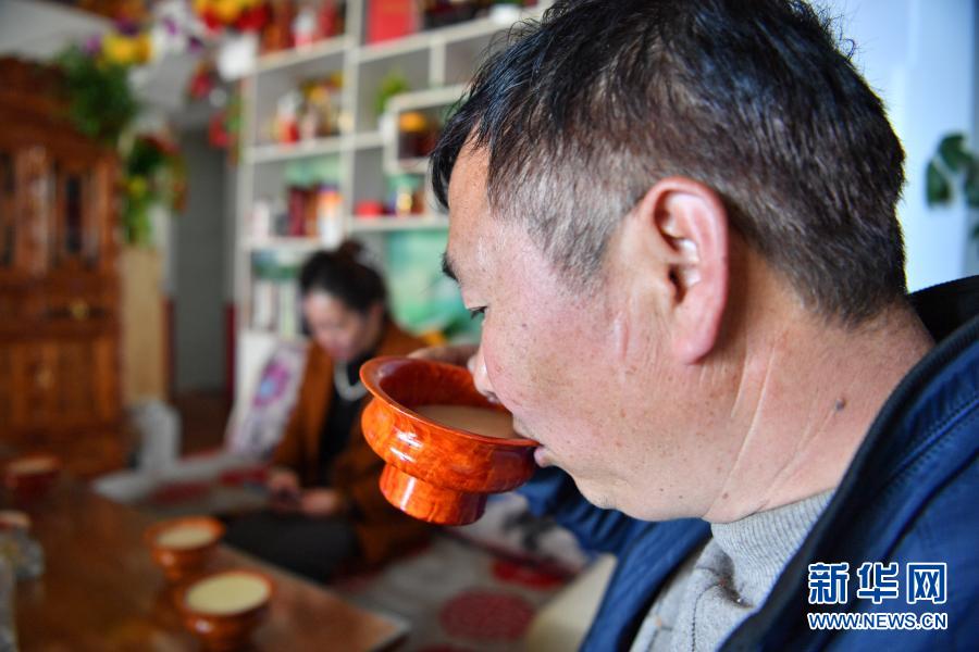 陈千在喝妻子为他打的酥油茶(2月25日摄)。