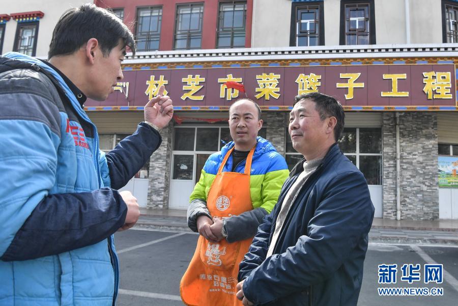 陈千(右)和林芝市菜篮子工程惠民直销店的工作人员讨论蔬菜销售情况(2月25日摄)。