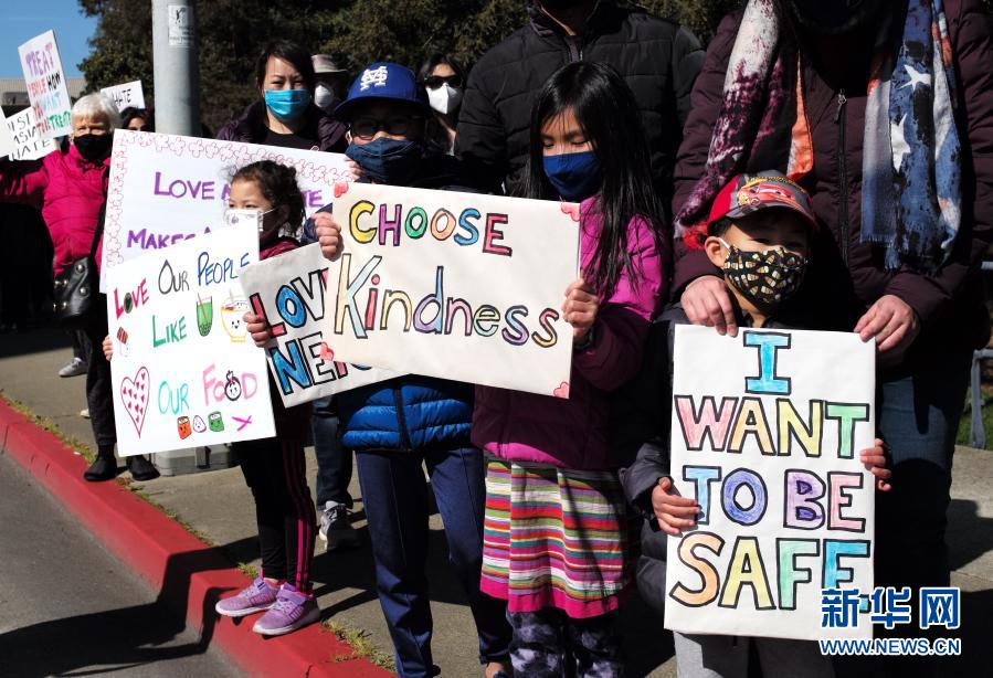 2月27日,在美国加利福尼亚州旧金山湾区圣马特奥市,人们参加集会反对针对亚裔的歧视行为和仇恨犯罪。