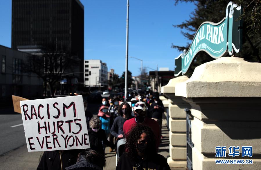2月27日,在美国加利福尼亚州旧金山湾区圣马特奥市,人们参加集会反对针对亚裔的歧视行为和仇恨犯罪。