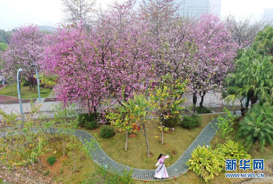 近日,广西柳州市种植的洋紫荆、黄花风铃木以及木棉花陆续盛开,如同给城市穿上靓丽的春装,美不胜收。