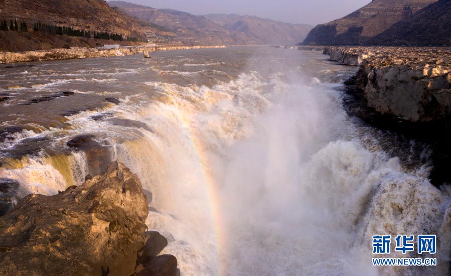 2月23日,壶口瀑布出现彩虹(无人机照片)。