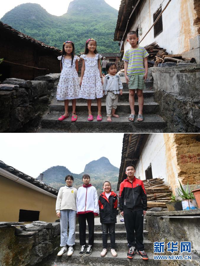 这张拼版照片显示的是龙璐婷、龙璐莹、龙紫贤、龙杰(从左至右)在铜板屯的合影(上图摄于2013年7月23日,下图摄于2021年2月15日)。