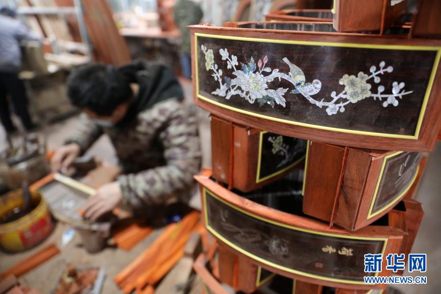 2月28日,在焦作市温县招贤乡太涧村,一家古筝厂的工人在加工古筝部件。